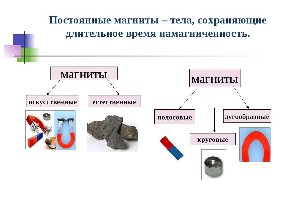 Постоянные магниты могут быть естественного происхождения (магнетит) и искусственными, которые изготавливают из железа, стали, никеля, кобальта и других, более редких металлов. Искусственные магниты получают с помощью намагничивания заготовок в сильном магнитном поле. Эти магниты могут иметь разную форму и размеры.