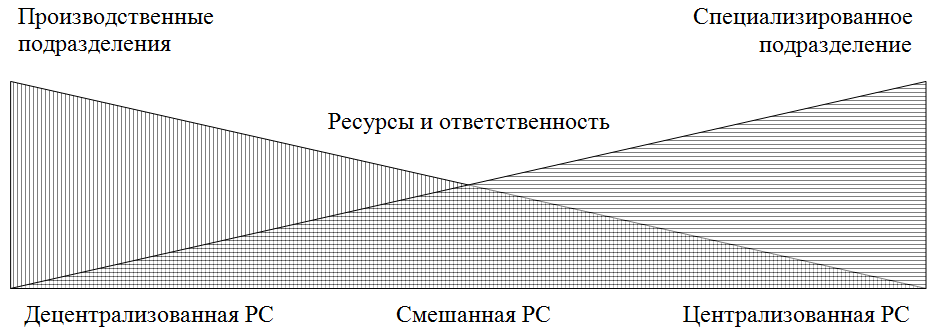 Классические способы организации РС [] характеризуются диапазоном форм от децентрализованной к централизованной, которые отличаются степенью концентрации управления силами и средствами в рамках единой специализированной структуры на предприятии ().