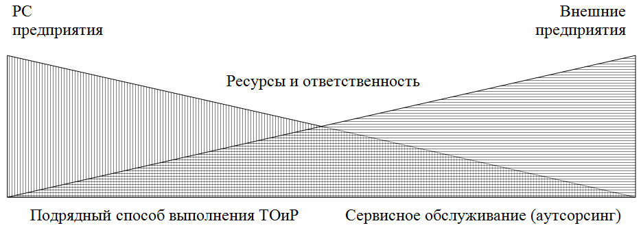 Наиболее распространёнными на отечественных предприятиях являются смешанные формы организации РС, в то время как зарубежная практика свидетельствует о высокой эффективности централизованных форм ТОиР оборудования [], в том числе построения системы ТОиР на основе альтернативных способов организации РС.