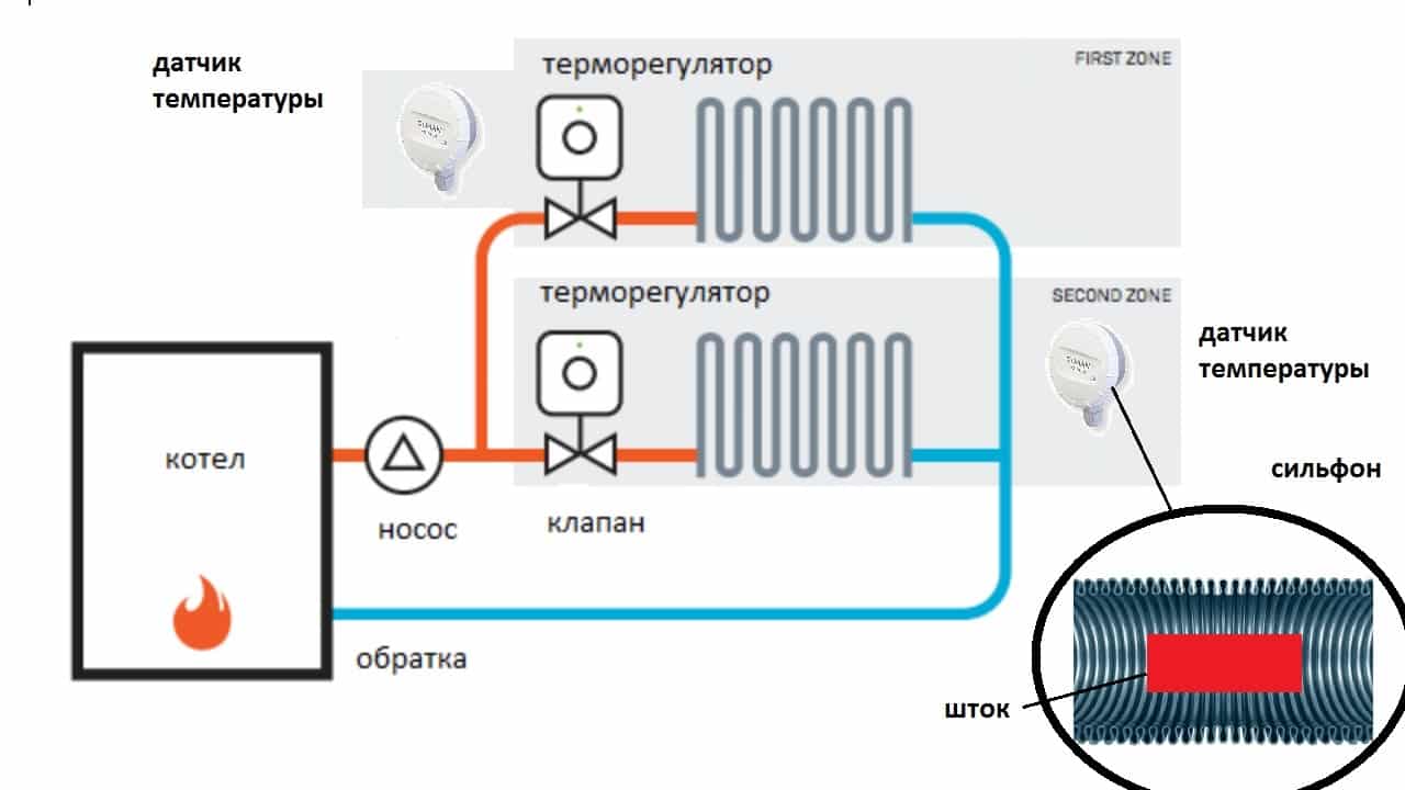 - После того, как температура в комнате опуститься менее нижнего предела, шток отпустит клапан терморегулятора и восстановит нормальное движение теплоносителя по системе. Начнется следующий этап нагрева воздуха в помещении, пока температура не достигнет установленного в терморегуляторе значения.