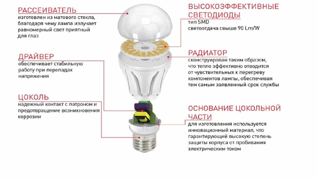 Конструктивно светодиодная лампа напоминает лампу Ильича, но в отличии от последней содержит в себе: