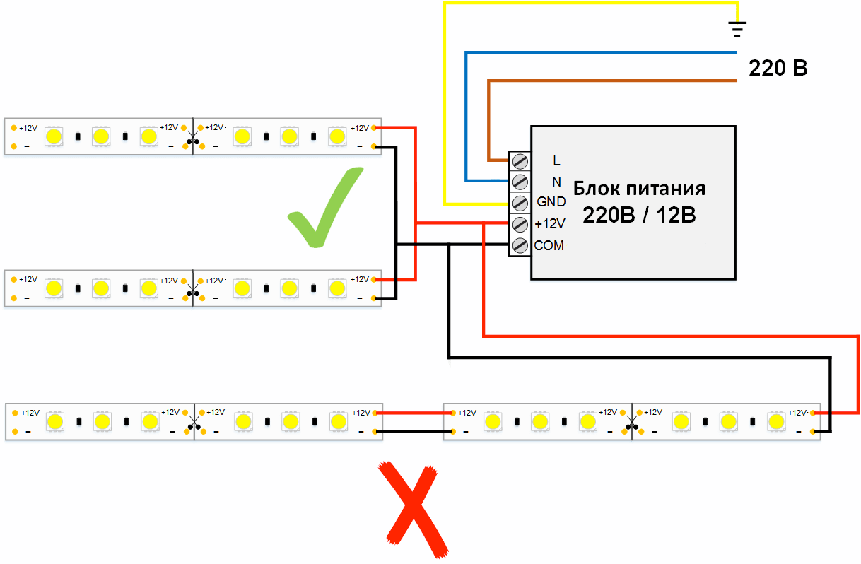 Производить подключение обязательно необходимо через трансформатор, чтобы LED-лента выдержала перепады напряжения и прослужила вам дольше.