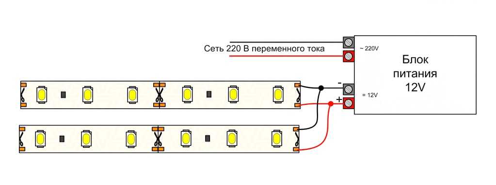 В обычных условиях лента подключается своими руками к сети через блок питания — прибор включают в сеть, а ленту подключают к выходу 12 В. При этом, могут быть разные варианты подключения. Например, при необходимости автоматически включать подсветку зеркала при включении общего освещения в ванной, блок питания просто присоединяют к выключателю.