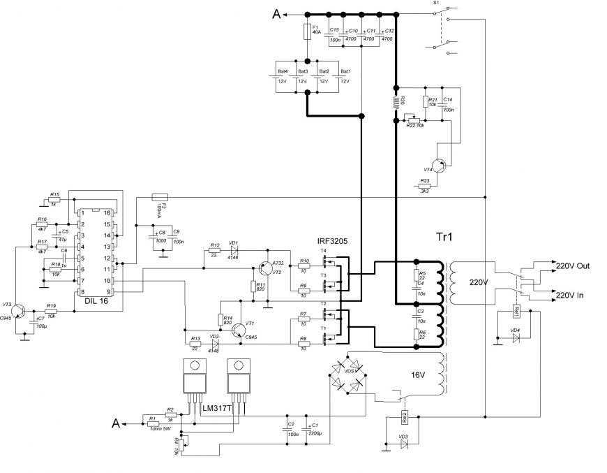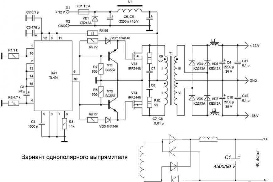 - Внутренняя схема питания, состоящая из источника напряжения на 12 В, и ток минимум 300 мА. Назначение этого источника – запитка схемы БП.