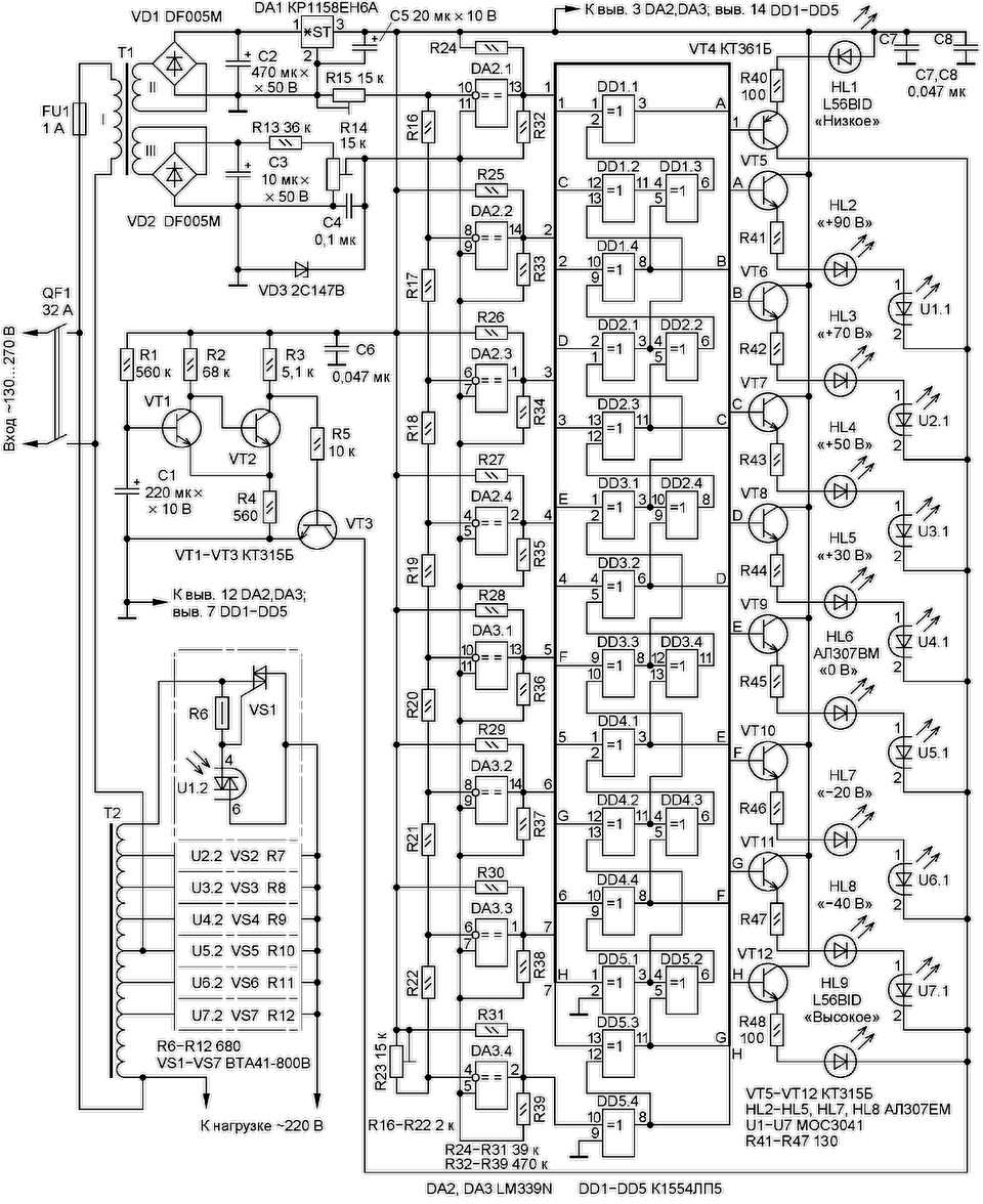 - Оптронные ключи (7) с симисторами VS от 1 до 7, резисторами R от 6 до 12 и оптронными симисторами U от 1 до 7;