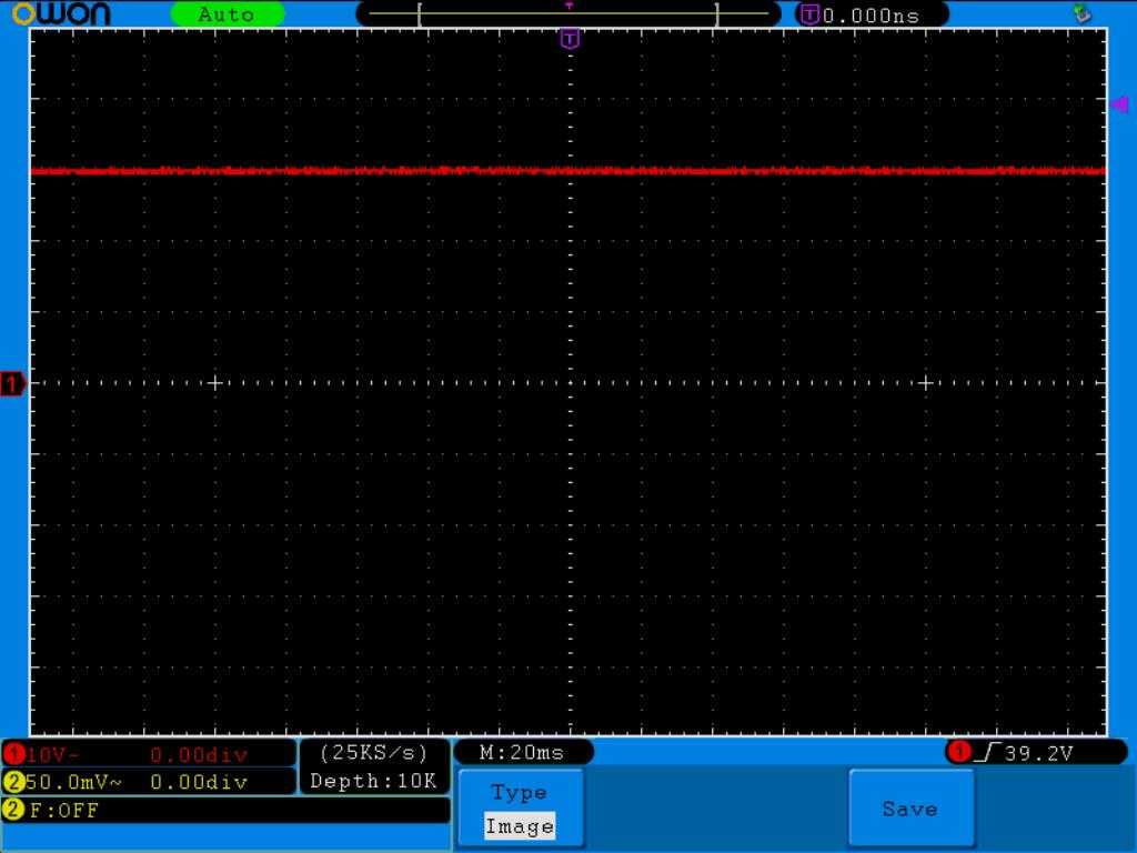 Давайте подадим постоянное напряжение. Как вы могли заметить, осциллограмма постоянного напряжения — это также прямая линия, параллельная оси времени. Это говорит нам о том, что с течением времени значение постоянного напряжение не меняется, о чем нам лишний раз доказывает осциллограмма.