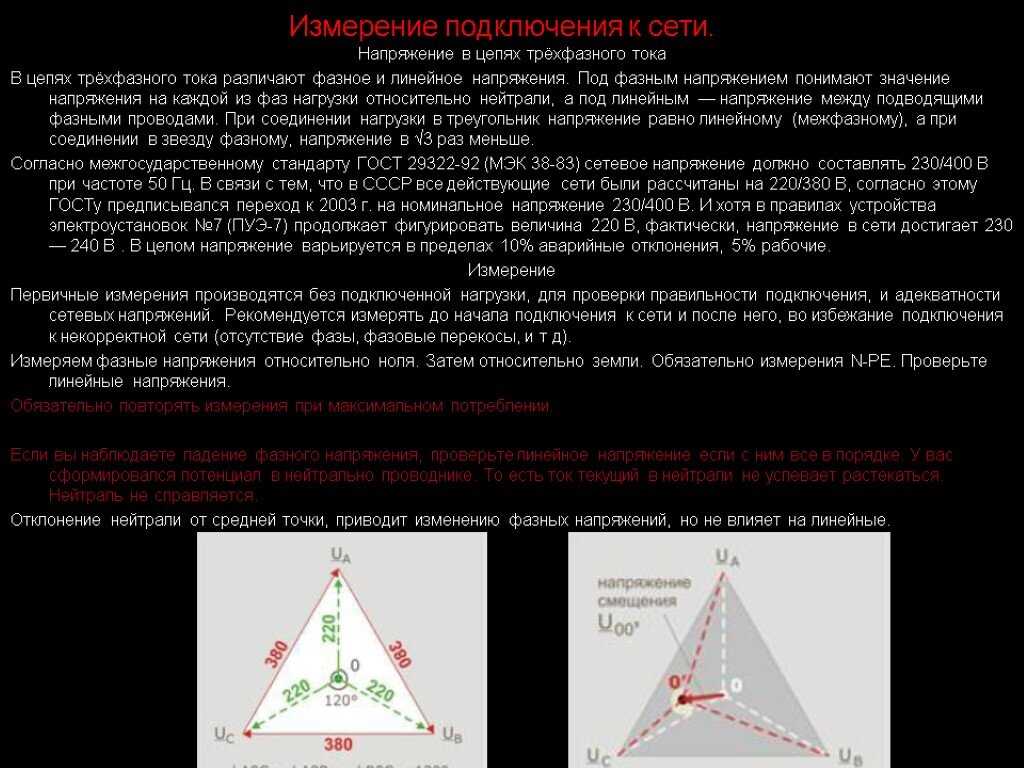Итак, фазное напряжение должно определяться непосредственно между началом и концом фазы. Линейное напряжение измеряют между 2-мя фазами. То есть, между выводами разных фаз.