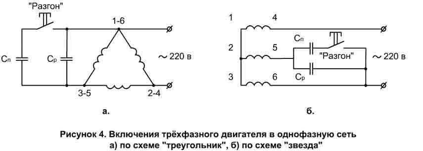 В последнем случае, при подключении трёхфазного двигателя к однофазной цепи потеря составит 2/3 от установленной мощности. Поэтому, моторы, с обозначением 380/660 запитывать от 220 вольт, хотя и возможно, но абсолютно нецелесообразно. Для подключения двигателя к однофазной цепи используются два варианта: