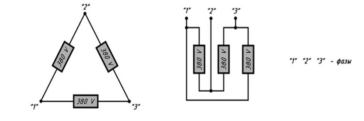 Отдельные потребители (нагрузки), которые питаются от раздельных пар проводов, точно так же могут соединяться или звездой или треугольником. В итоге получается ситуация, аналогичная генератору: при соединении треугольником – нагрузки находятся под линейным напряжением, при соединении звездой – напряжение в 1,73 раза меньше.