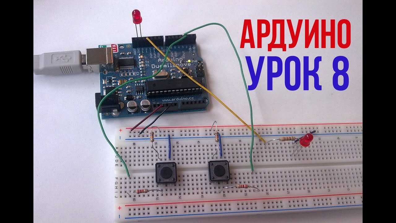 Постараемся исправить ситуацию. Мы знаем, что дребезг контактов проявляет себя в течение нескольких миллисекунд после замыкания контактов. Давайте после изменения состояния кнопки выжидать, скажем, 5 мсек. Это время для человека является практически мгновением, и нажатие кнопки человеком обычно происходит значительно дольше – несколько десятков миллисекунд. А Arduino прекрасно работает с такими короткими промежутками времени, и эти 5 мсек позволят ему отсечь дребезг контактов от нажатия кнопки.Скетч обработки нажатия кнопки с задержкой для устранения эффекта дребезга контактов int switchPin = 2; // пин кнопки int ledPin = 13; // пин светодиода boolean lastButton = false; // предыдущее состояние кнопки boolean currentButton = false; // текущее состояние кнопки boolean ledOn = false; // состояние светодиода void setup() { pinMode (switchPin, INPUT); pinMode (ledPin, OUTPUT);} void loop() { currentButton = debounce (lastButton); // получаем состояние кнопки без дребезга if (lastButton == false && currentButton == true) { // если кнопка была нажата дольше 5 мсек, ledOn = !ledOn; // то меняем состояние светодиода } lastButton = currentButton; // обнуляем состояние нажатия кнопки digitalWrite (ledPin, ledOn); // зажигаем/гасим светодиод} // Процедура определения нажатия кнопки без дребезга:boolean debounce(boolean last) { boolean current = digitalRead(switchPin); // считываем текущее состояние кнопки if (last != current) { // если состояние изменилось delay(5); // делаем задержку на 5 мсек, пока уляжется дребезг current = digitalRead(switchPin); // и считываем снова } return current; // возвращаем текущее состояние кнопки} В данном скетче мы объявим процедуру debounce() («bounce» по-английски – это как раз «дребезг», приставка «de» означает обратный процесс), на вход которой мы подаём предыдущее состояние кнопки. Если нажатие кнопки длится более 5 мсек, значит это действительно нажатие. Определив нажатие, мы меняем состояние светодиода.