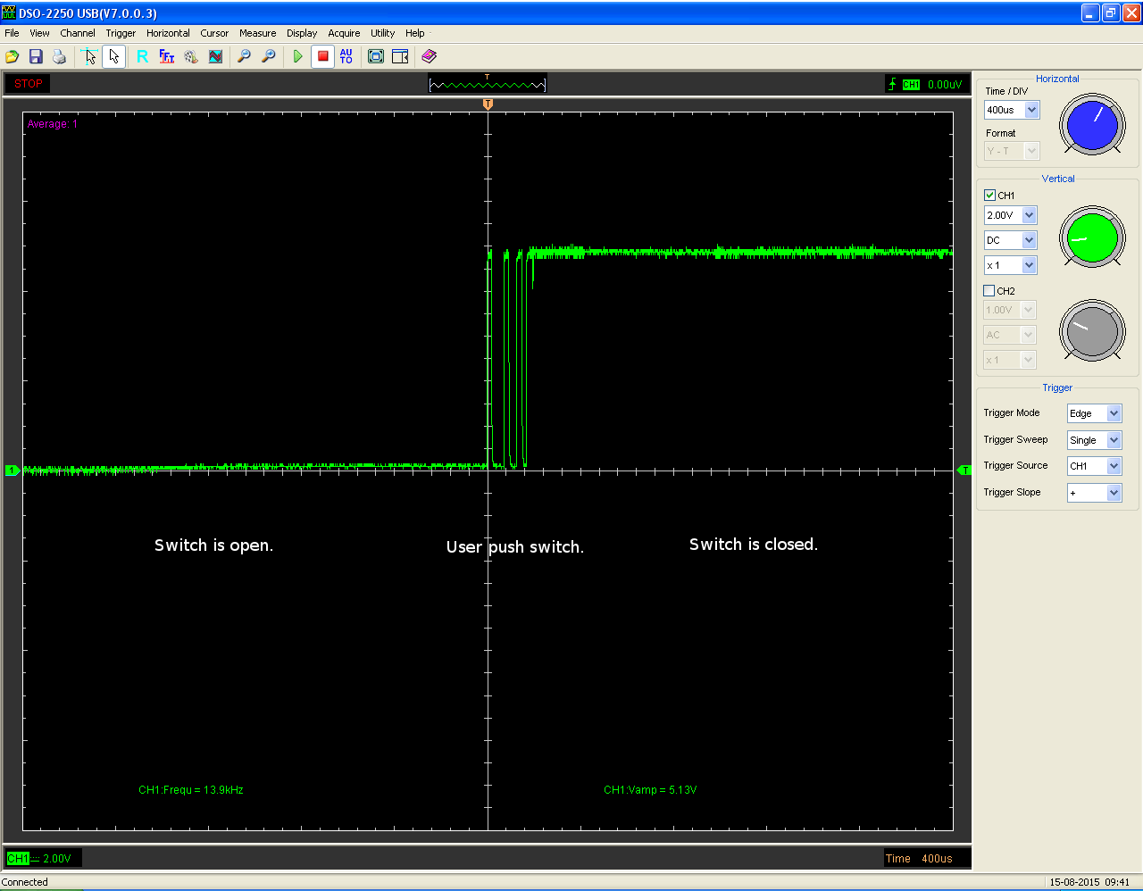 Что такое дребезг контактов? Когда вы нажимаете на кнопку или на микропереключатель или изменяете положение тумблера, два металлических контакта замыкаются. Для пользователя может показаться, что контакт наступил мгновенно. Это не совсем правильно. Внутри коммутатора есть движущиеся части. Когда вы нажимаете на коммутатор, он вначале создает контакт между металлическими частями, но только в кратком разрезе микросекунды. Затем он делает контакт немного дольше, а затем еще немного дольше. В конце коммутатор полностью замыкается. Коммутатор скачет (дребезжит) между состояниями наличия и отсутствия контакта. «Когда коммутатор замыкается, два контакта фактически разъединяются и снова соединяются обычно от 10 до 100 раз за время, примерно равное 1 мс» («Искусство схемотехники», Хоровиц и Хилл, второе издание). Обычно оборудование работает быстрее, чем дребезг, что приводит к тому, что оборудование думает, что вы нажали на кнопку несколько раз. Оборудование часто является интегральной микросхемой. Следующие скриншоты иллюстрируют типовой дребезг контактов без какой-либо обработки: