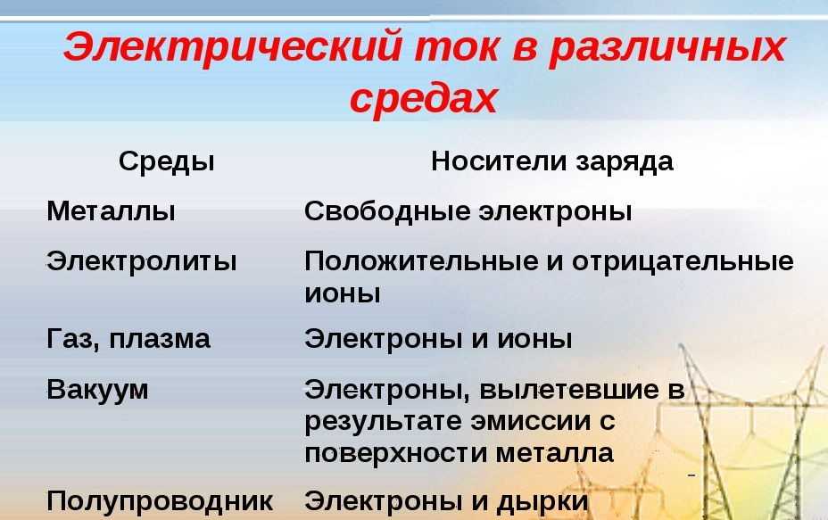 Электрический ток в разных средах протекает по-разному, специалисты рассматривают его протекание в твердых материалах, к ним относятся: проводники (металл, медь, железо, алюминий), полупроводники и материал, не проводящий ток (диэлектрик). Необходимо всегда учитывать состояние среды, в которой находятся носители зарядов, а именно:
