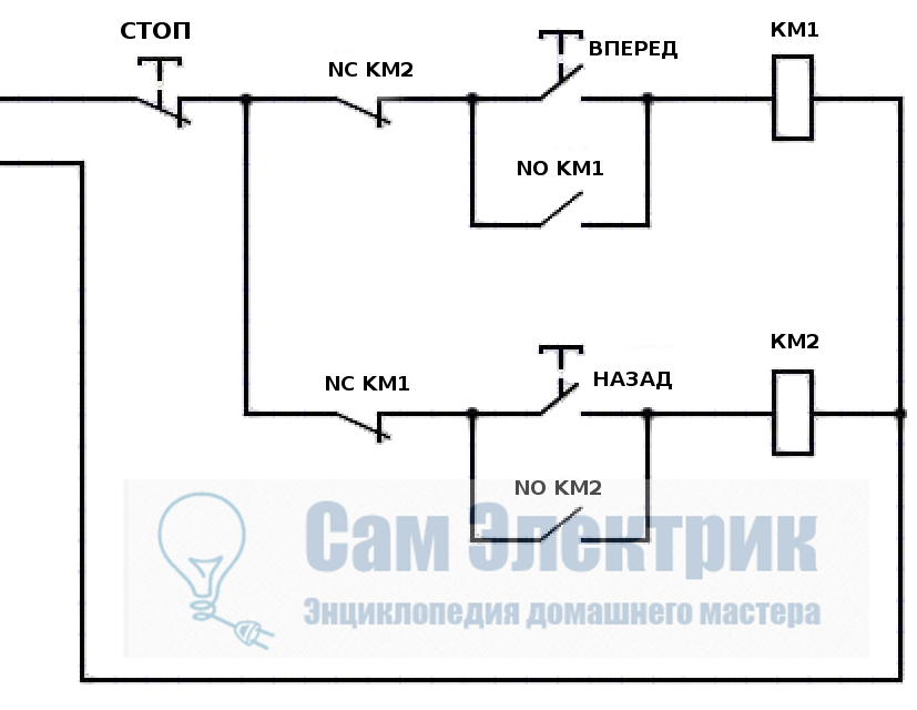 На контакторе КМ2 происходит замена фаз L1 на L3, а L3 на L1, таким образом меняется направление вращения электродвигателя. В принципе данная схемотехника управления трехфазной и однофазной нагрузкой с головой покрывает домашние нужды, и проста для понимания. Можно также подключить дополнительные элементы автоматики, защиты, ограничители. Рассматривать их все нужно отдельно для каждого конкретного устройства.