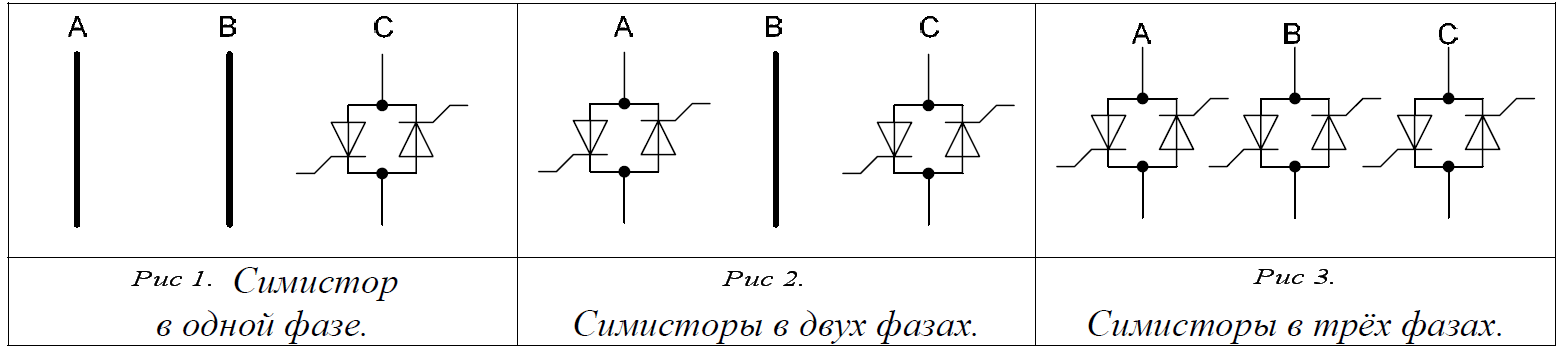 Основой силовой части тиристорного устройства плавного пуска является симисторный ключ (два тиристора, включенных встречно-параллельно). Возможны три варианта построения схемы силового каскада (рис. 1):