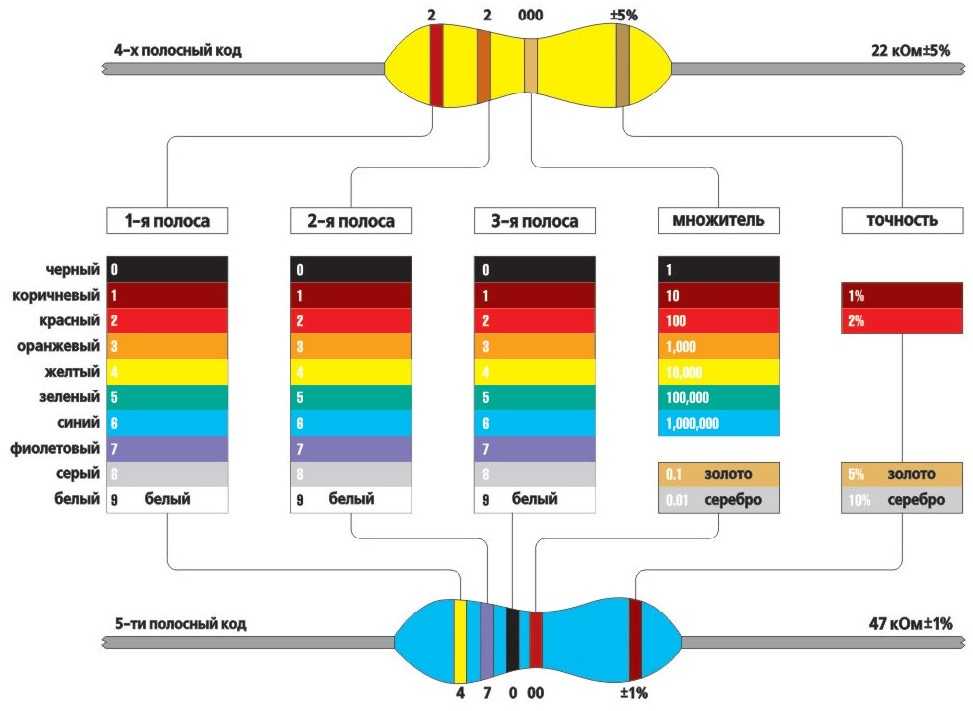Для маркировки малогабаритных резисторов используют цветовой код, состоящий из цветных полосок. Существуют маркировки резисторов с использованием 4-х полос и 5-ти полос. Каждому цвету соответствует определенное число.