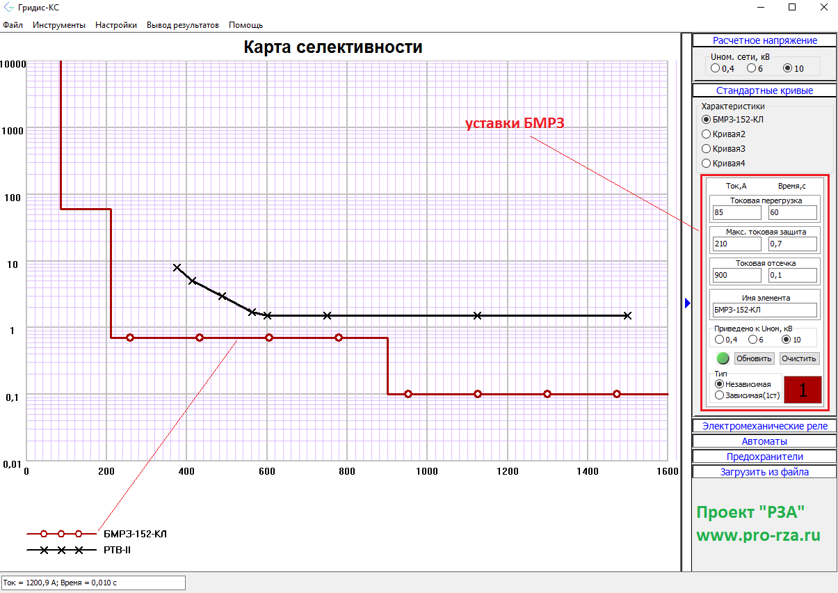 Защита на БМРЗ-152-КЛ имеет трехступенчатую характеристику (перегрузка, МТЗ, отсечка). Все ступени выбраны независимыми. Нанесем их на карту селективности при помощи вкладки “Стандартные кривые”