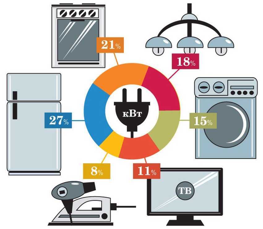 Из таблицы ниже можно сделать вывод, какие бытовые приборы потребляют больше электроэнергии. К ним относится система освещения, холодильник, телевизор, компьютер, стиральная машина, электрочайник и утюг. Суммарное значение в среднем составляет 120-180 кВт в месяц. К дополнительным затратам можно отнести использование мелкой бытовой техники в виде фена, кофеварки, комбайна, зарядных устройств и других элементов, который обеспечивают требуемый уровень комфорта. В летний период времени также учитывается использование кондиционера, а зимой – масляных электрических обогревателей, которые прибавляют 60-100 кВт.