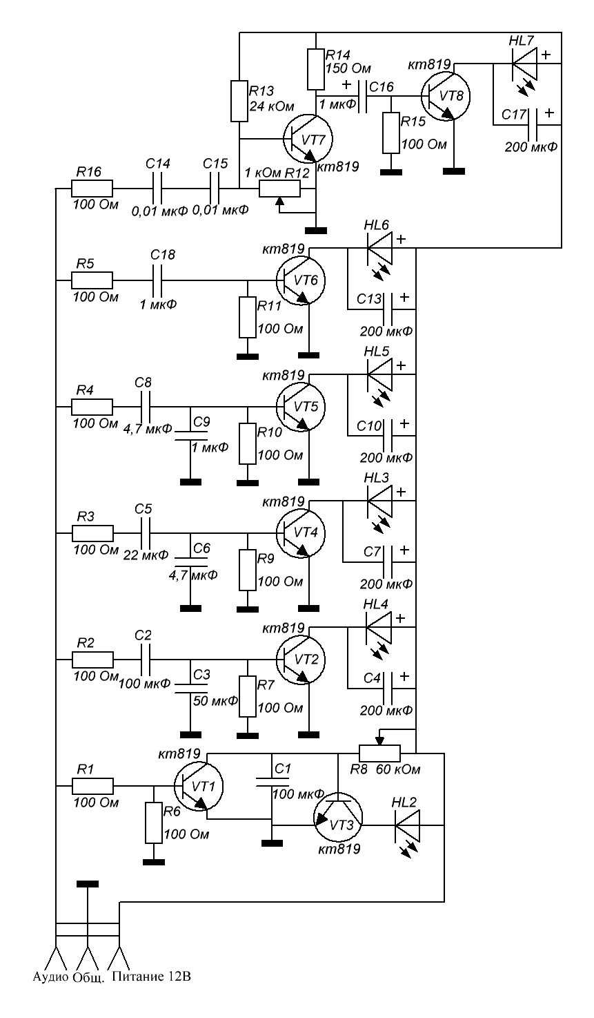 , включенных в его коллекторную цепь, зажигаются. И чем больше амплитуда входного сигнала, тем сильнее открывается транзистор, тем ярче горят светодиоды. Для ограничения максимального тока через светодиоды последовательно с ними включены резисторы R8