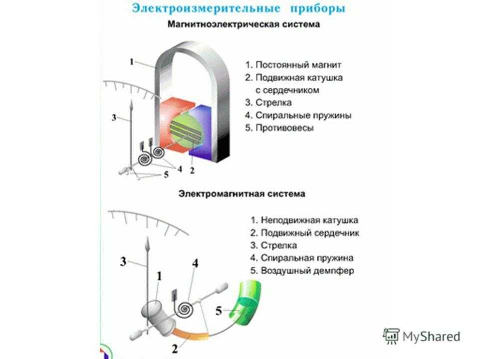 Принцип действия приборов магнитоэлектрической системы основан на взаимодействии поля постоянного магнита и проводников с током, а электромагнитной — на втягивании стального сердечника в неподвижную катушку при существовании в ней тока. Электродинамическая система имеет две катушки. Одна из катушек, подвижная, укрепляется на оси и располагается внутри неподвижной катушки.
