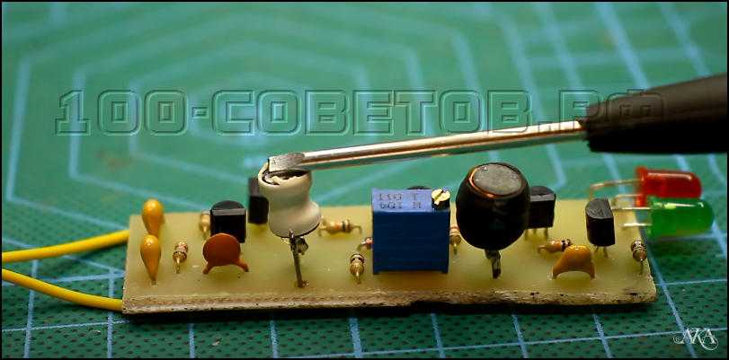 Подаем питание на схему, если светится красный светодиод вращаем подстроечник до того момента, когда красный полностью отключиться и начнёт светиться зеленый.