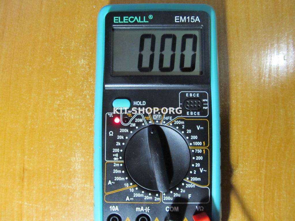 На индикаторе должна быть единица. Если это не так — прибор нуждается в ремонте. Замыкаем накоротко щупы. На дисплее должна выйти цифра ноль. Если всё так и происходит — прибор исправен. Если цифры меняются, отображаются тускло, попробуйте поменять элемент питания прибора на заведомо свежий и рабочий. Не помогло — мультиметр надо ремонтировать. Для проверки лампочки ставим селектор мультиметра на символ поиска обрыва. На корпусе в этом месте схематично изображён диод.