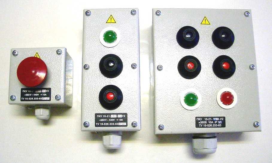 Если говорить о более простых аппаратах, то стандартные посты чаще всего применяют для контроля различных силовых приспособлений (электрических двигателей). Обычно это пускатель типа «Старт-Стоп», имеющий всего две кнопки с одноименными названиями. Применимо это не только к магнитным пускателям, но и к другим видам реле.