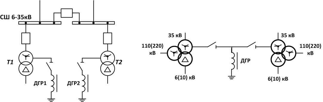 Дугогасящие реакторы должны подключаться к нейтралям трансформаторов, генераторов или синхронных компенсаторов через разъединители. В цепи заземления реакторов должен быть установлен трансформатор тока. Рекомендуемые схемы подключения ДГР представлены на рис. 4.