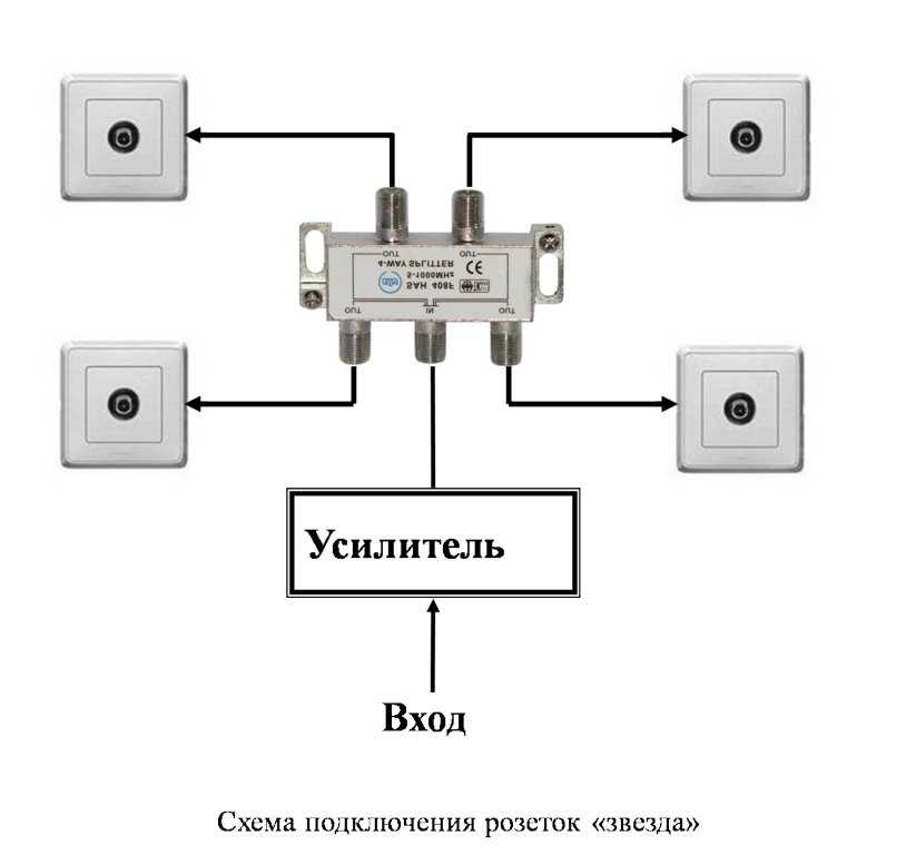 Изображенная на рисунке схема подключения телевизионных розеток носит название «соединение звездой» и обладает рядом преимуществ: