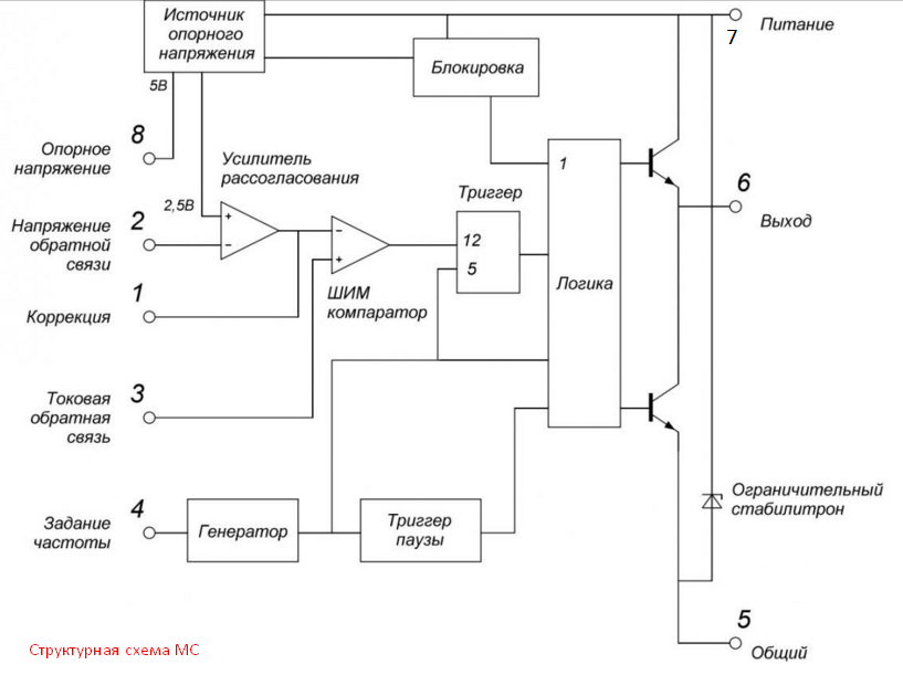 Поговорим о том, что проще. Перед проверкой обязательно выключите инвертор от сети питания. Далее — от внешнего регулируемого блока питания на вывод 7 микросхемы подаём напряжение 16 — 17 вольт, это напряжение запуска МС. При этом на выводе 8 должно быть 5 В. это опорное напряжение от внутреннего стабилизатора микросхемы.