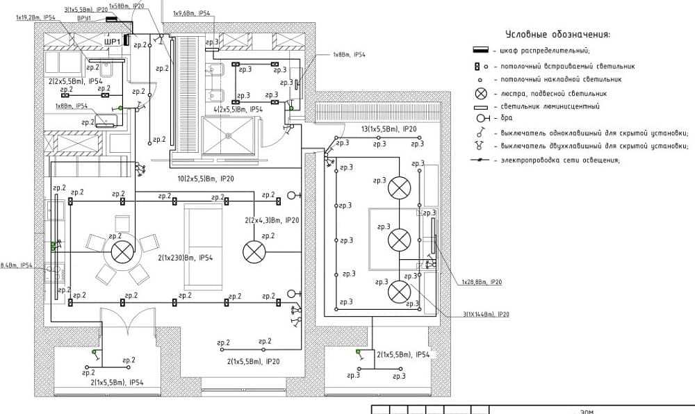 Каждая отдельная линия проводки обозначается буквенными и числовыми символами, в представленном плане это гр1, гр2 и гр3. Группы светильников записываются в формате AA(B x CC)DD, где АА – количество осветительных приборов в группе, B – число лампочек в светильнике, СС – мощность в Ваттах, DD – класс безопасности устройства.