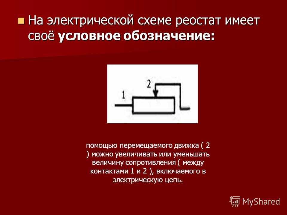 Красный прямоугольник – сопротивление, синий – контакт, подводящий провод, зеленый – скользящий контакт. Если ползунок передвинуть влево, сопротивление реостата уменьшается, а при движении вправо – увеличивается.