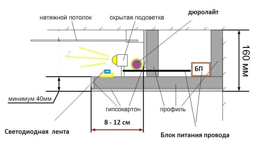 Схема монтажа короба под натяжным потолком с гипсокартонной конструкцией.