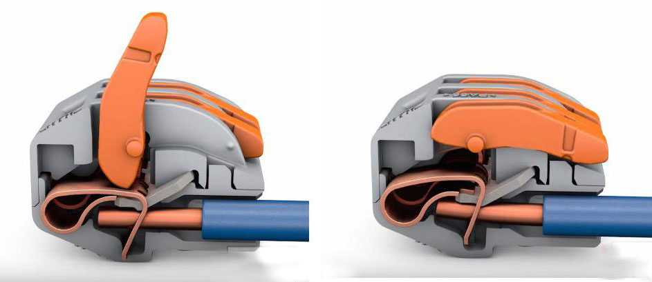 Для того, чтобы подсоединить проводник, нужно поднять оранжевый рычажок вверх до фиксации. При этом открывается окно для ввода проводника, затем необходимо ввести проводник со снятой изоляцией во входное отверстие клеммы и опустить рычажок в исходное положение. При этом становится невозможным самопроизвольное отсоединение проводников от клеммы.