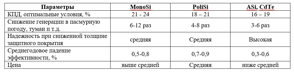 Современный рынок предлагает несколько типов полупроводниковых ячеек, каждый из которых отличается различной производительностью в зависимости от внешних условий.