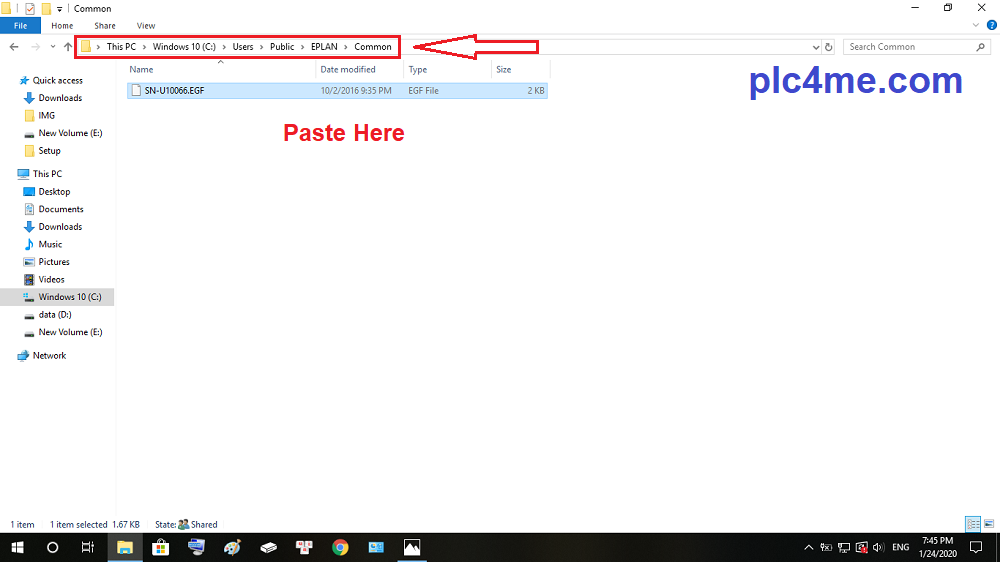+ 10 : Then navigate to the directory under this path: This PC > Windows10 (C) > Users > Public > EPLAN > Common and Paste the SN-U10066.EGF file just copied in the previous step