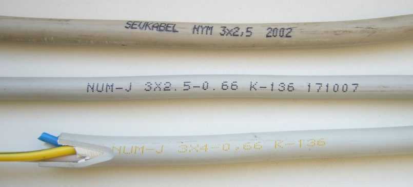 - NYM – провод из меди для внутренней одиночной линии. Имеет изоляционную ПВХ-оболочку и наружное покрытие, жилы с заземлением и без него.
