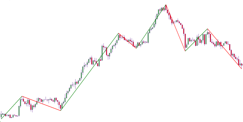 - волны коррекции противоположны направлению тренда и короче волн импульса